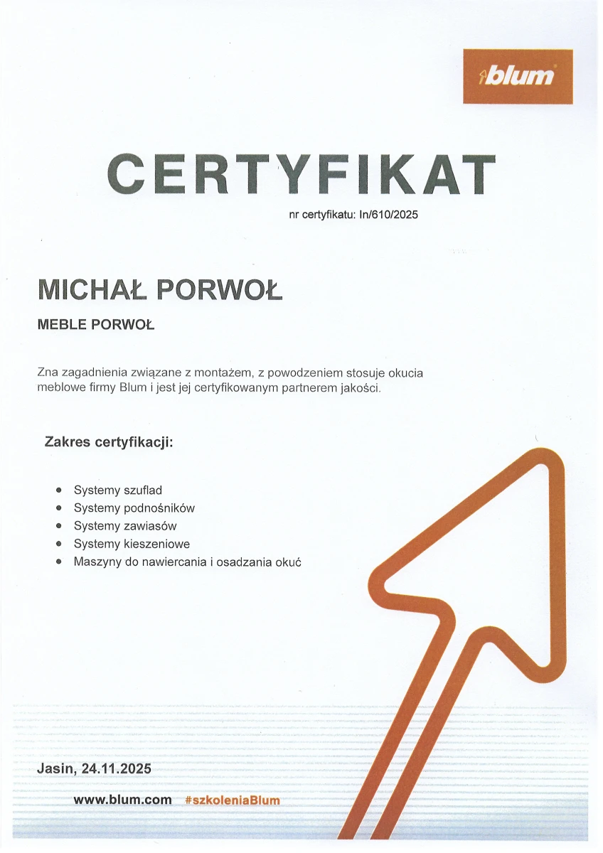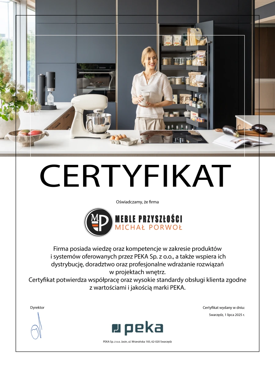 Witaj w Meble Porwoł – pracowni, w której nowoczesna technologia łączy się z precyzyjnym wykonaniem, by zaspokoić potrzeby nawet najbardziej wymagających właścicieli mieszkań, apartamentów i domów. Od 2013 roku projektujemy i realizujemy kuchnie, łazienki, sypialnie, garderoby, meble pokojowe i biurowe – zawsze dostosowane do wymiarów, stylu i codziennych zwyczajów użytkowników. Nasze rozwiązania cechuje funkcjonalność, design i trwałe materiały, wybrane spośród czołowych światowych producentów okuć i płyt.